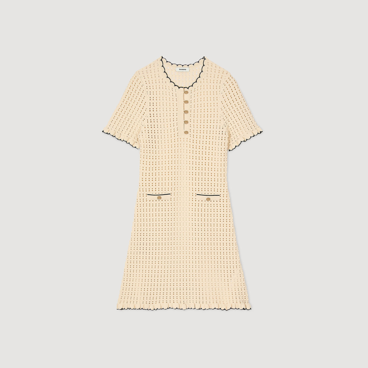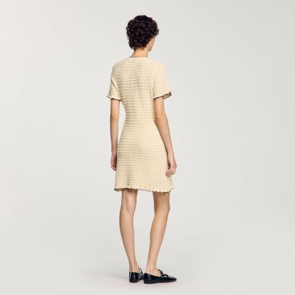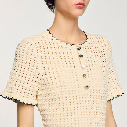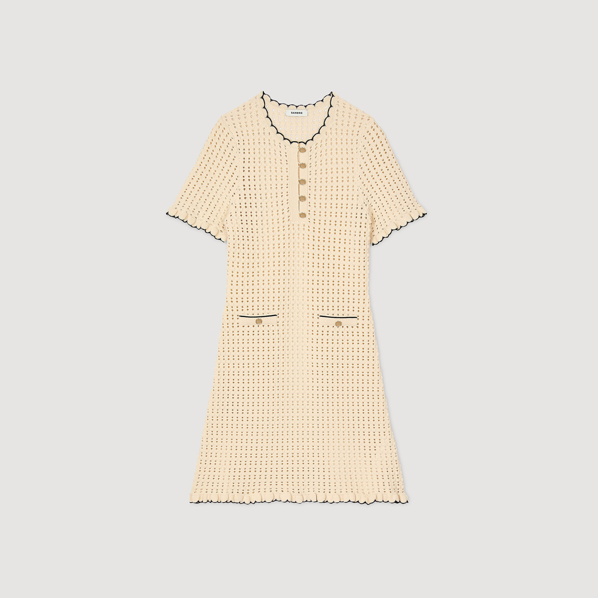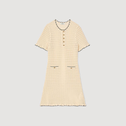 Short openwork dress with round buttoned neck, short sleeves and scalloped hems.