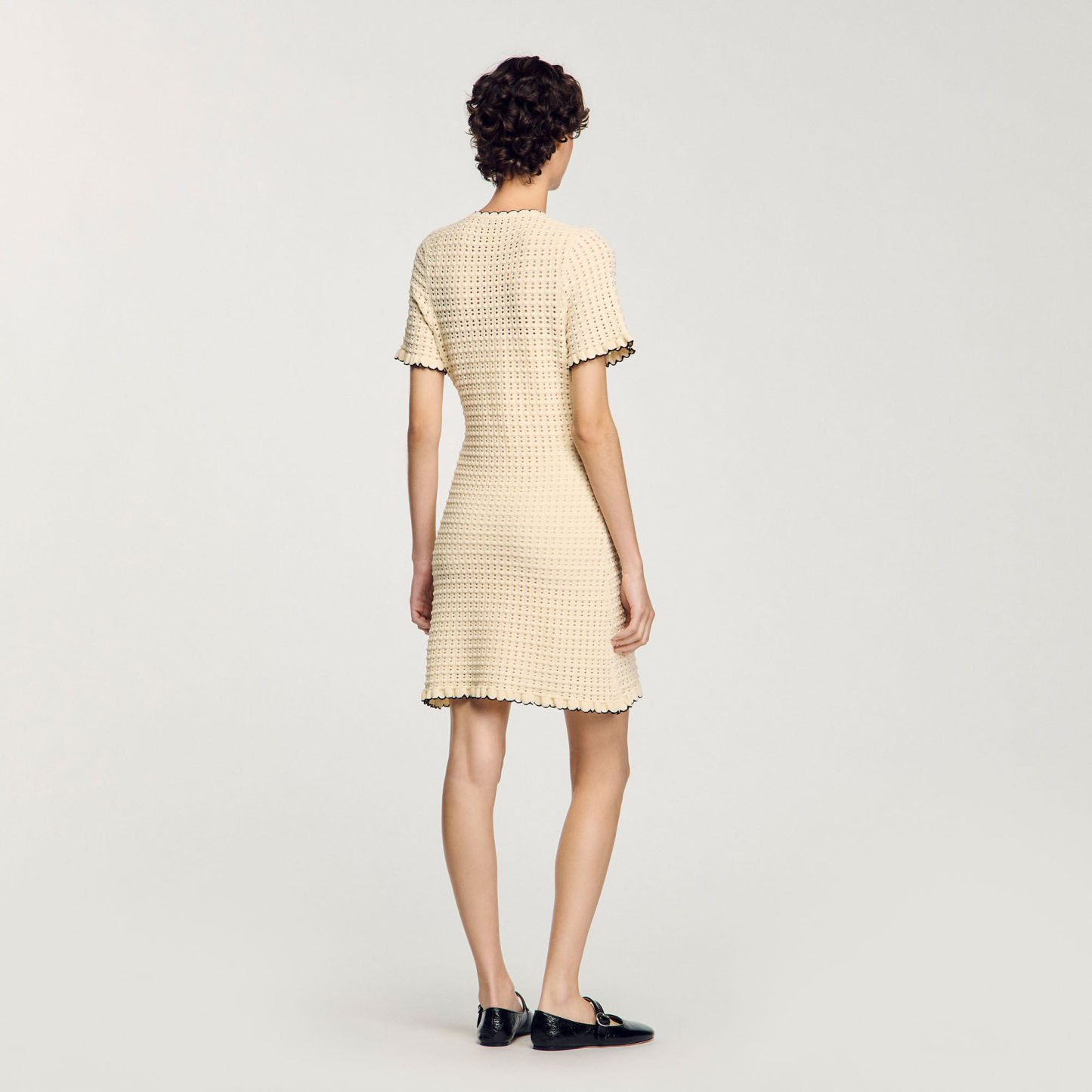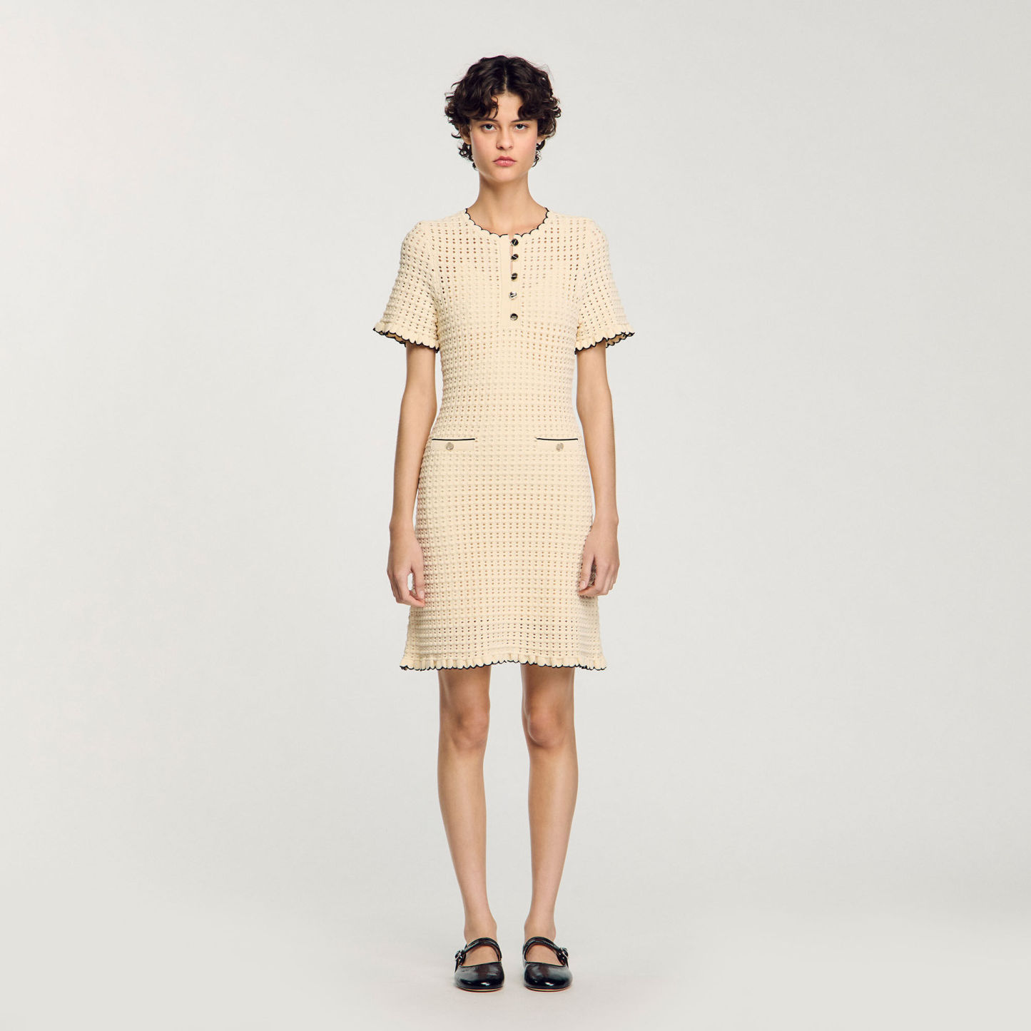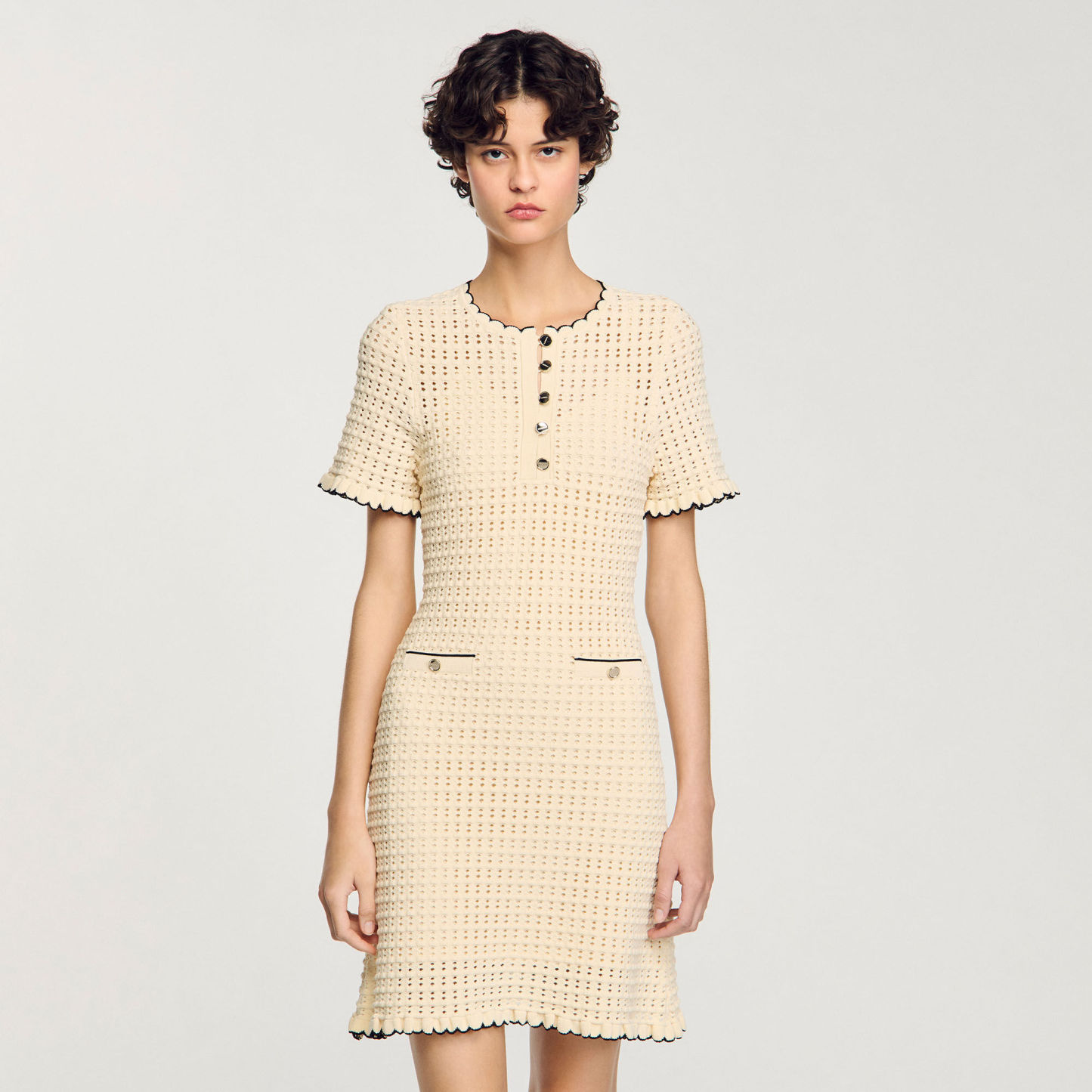 Short openwork dress with round buttoned neck, short sleeves and scalloped hems.