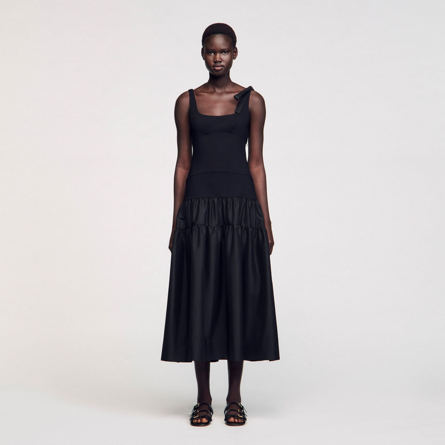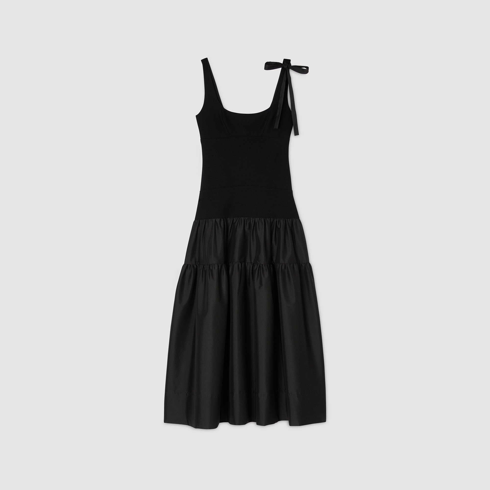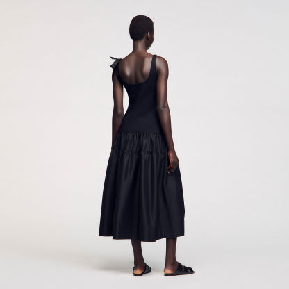 Maxi dual-material dress composed of a vest top with a strap featuring a bow and a full taffeta skirt.