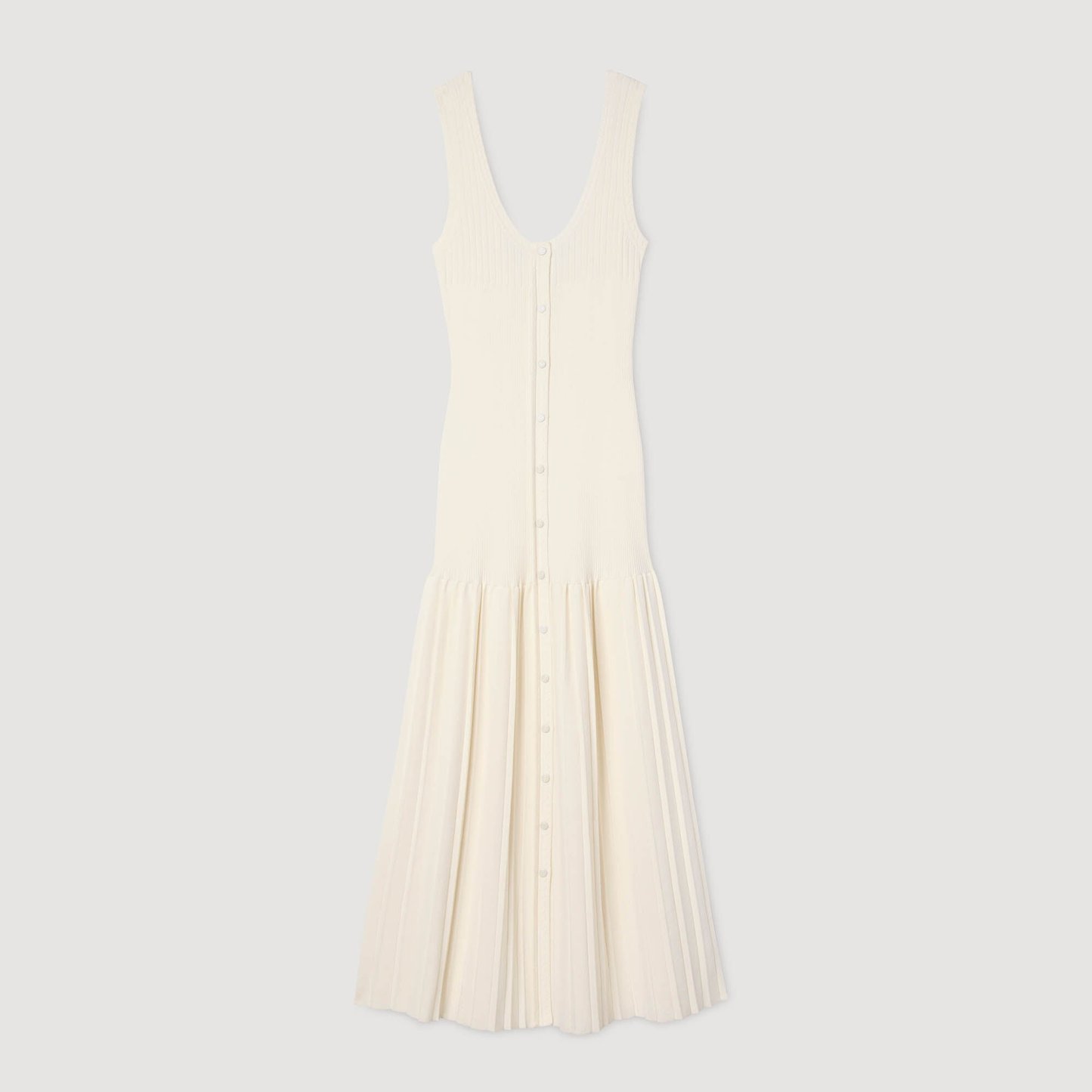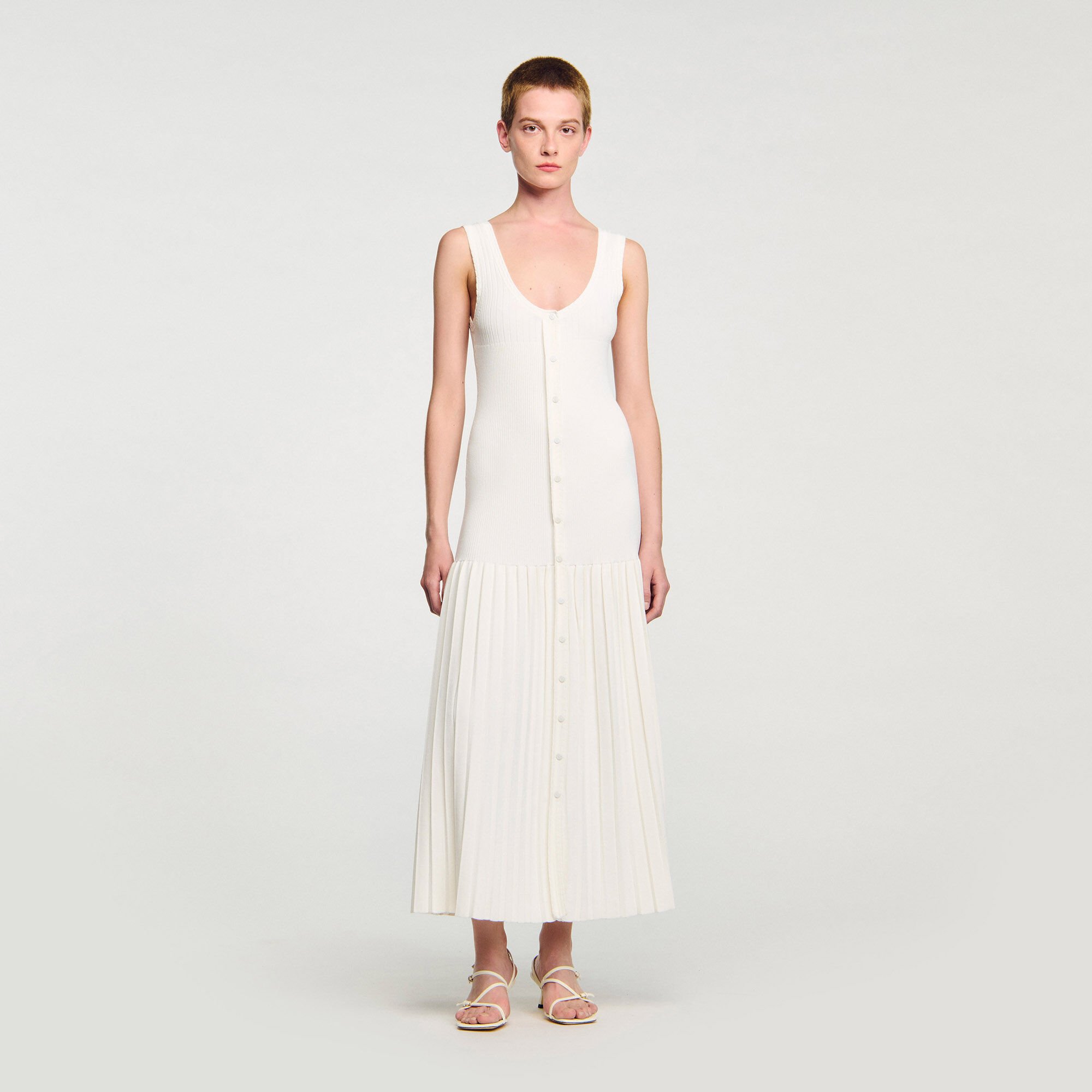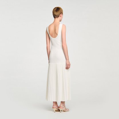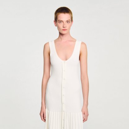 Maxi knit dress with straps, a press-stud fastening and a flared pleated-effect skirt.