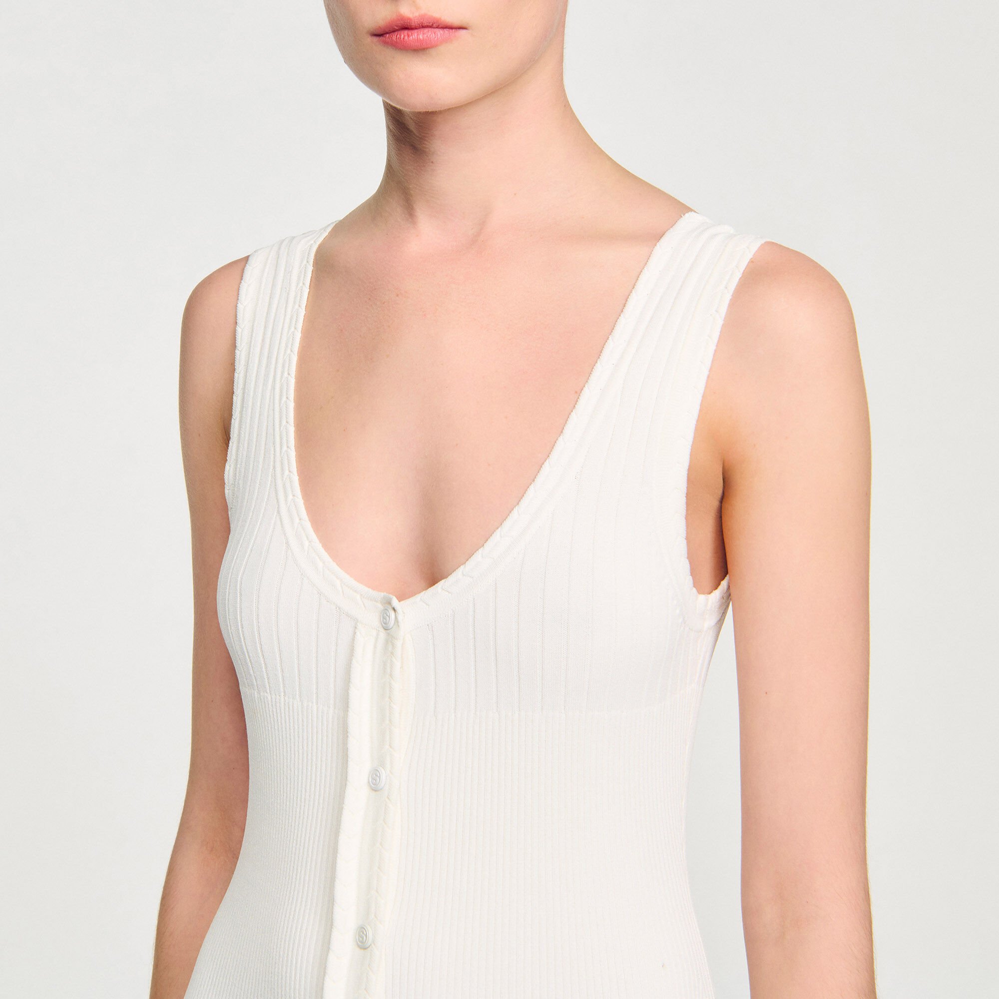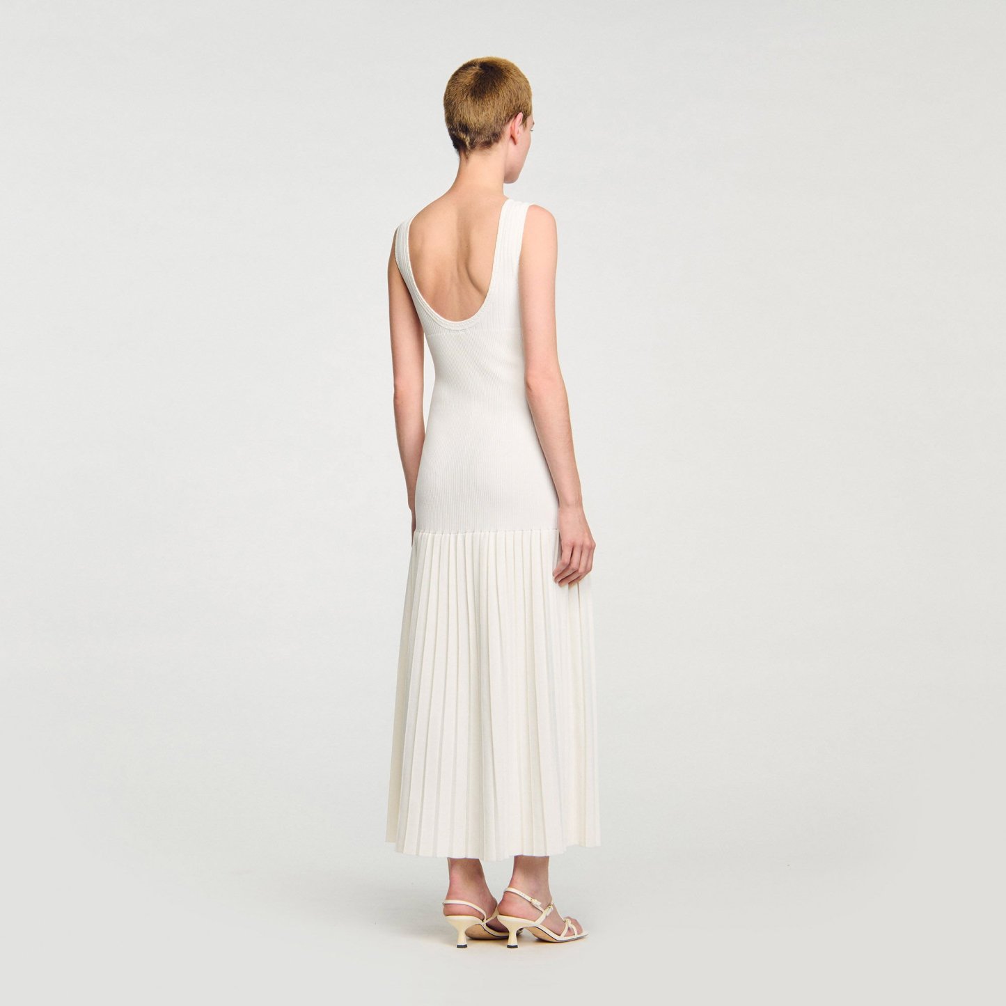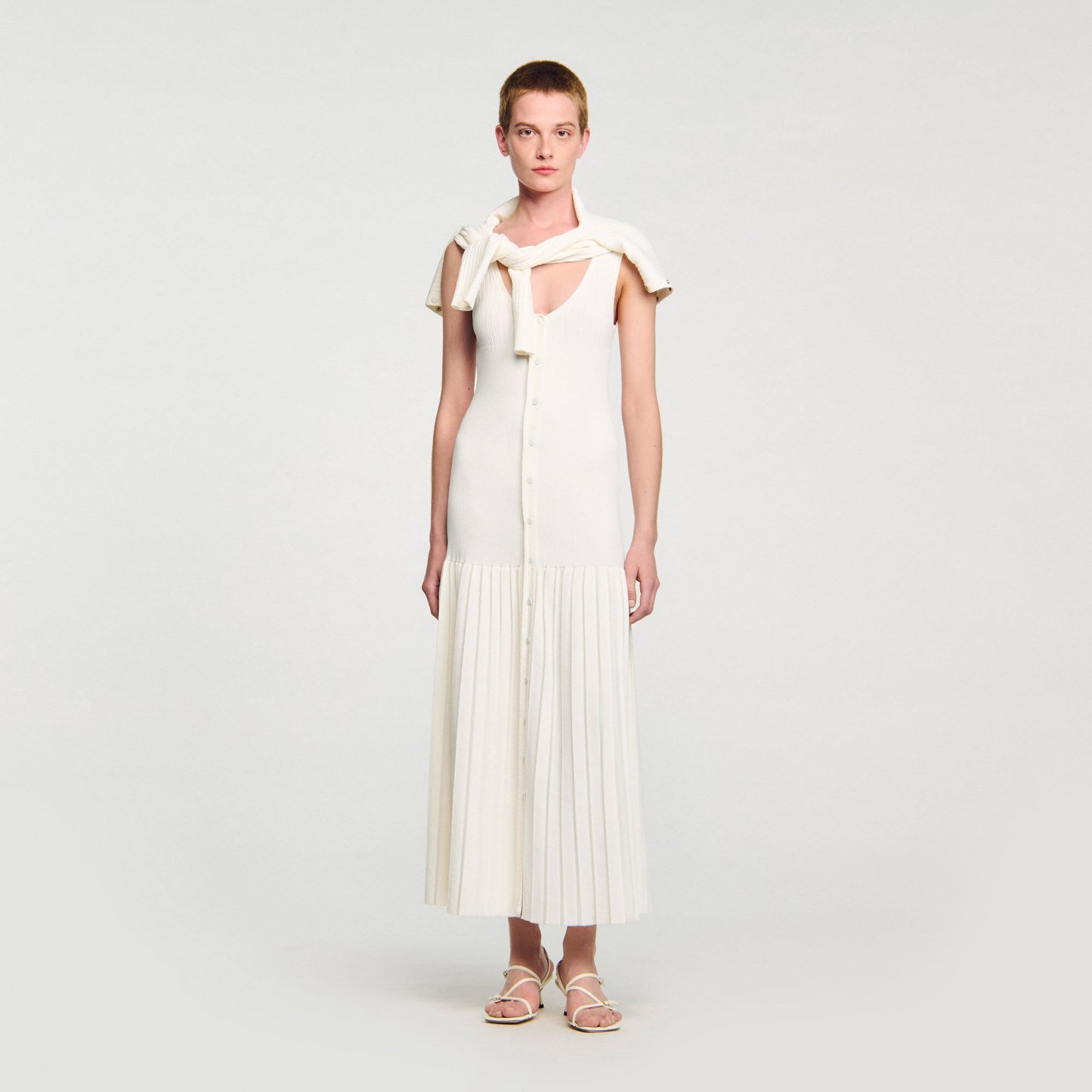 Maxi knit dress with straps, a press-stud fastening and a flared pleated-effect skirt.